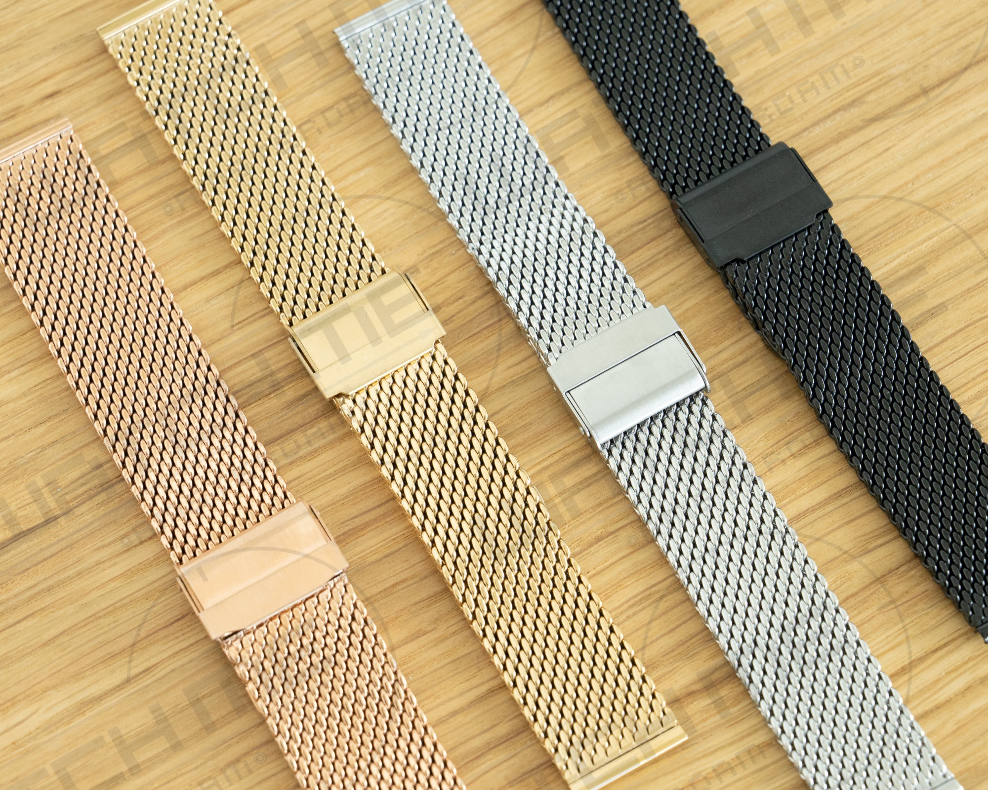 Roestvrij stalen horlogeband met veiligheidssluiting en verstelbare lengte. In 4 kleuren en maten verkrijgbaar.
